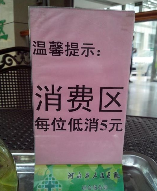 可有的医院在药品消费上做文章就在服务上打擦边球。河北省人民医院一楼大厅内设置休闲消费区,并且每位最低消费5元的消息,引发网友热议。此举遭到网友质疑。网友称去医院看病,不是去娱乐消费,而且还规定最低消费,谁有这样的心情消费?
