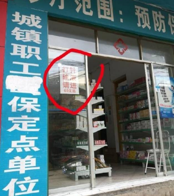 据媒体8月8日报道,毕节市纳雍县人民医院附近一卫生室玻璃门上,挂有“打针输液请进60元起”字样贴纸,引网友热议。