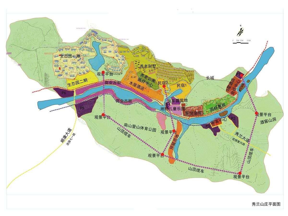 文化园总体规划分为南山、北山两大块,南山旅游运动休闲区,目前暂未开发,北山为秀兰山庄住宅区,山顶已削平,百余栋非法建筑别墅群位于该山。