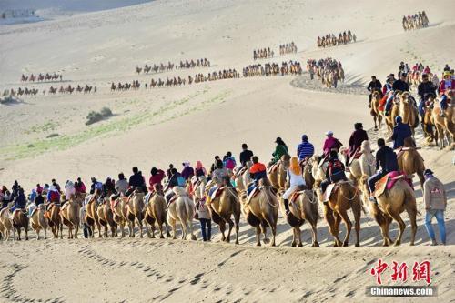 国庆长假期间,国际旅游名城甘肃敦煌著名景区鸣沙山月牙泉旅游迎来“高峰模式”。据统计,10月3日,该景区接待中外游客达到3万人次,掀起金秋敦煌旅游新高潮。王斌银 摄