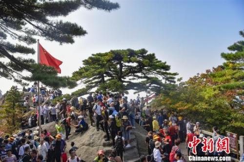 黄山迎客松景点附近游人如织。 杨传琳 摄