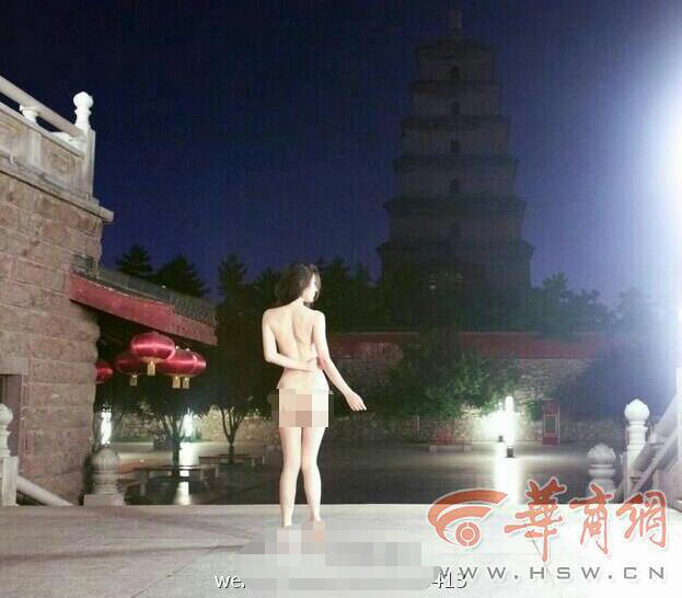 12月21日晚,微博一账号发出一张在大雁塔旁的女子裸体写真,写到:"逆天啦,网传女孩凌晨在大雁塔附近拍人体写真。"引发网友关注。到了22日下午,微博博主再次发出3张照片,除了一张为此前微博发出的照片外,另有一张裸体写真和一张女子照片,根据微博中@的对象,疑指照片中的女子为裸体写真中的女子。