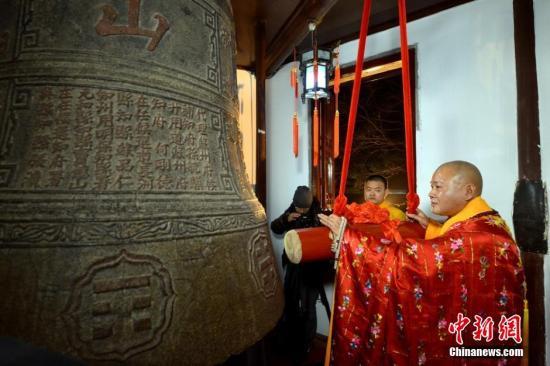 资料图 苏州寒山寺方丈敲响辞旧迎新钟声。王思哲 摄