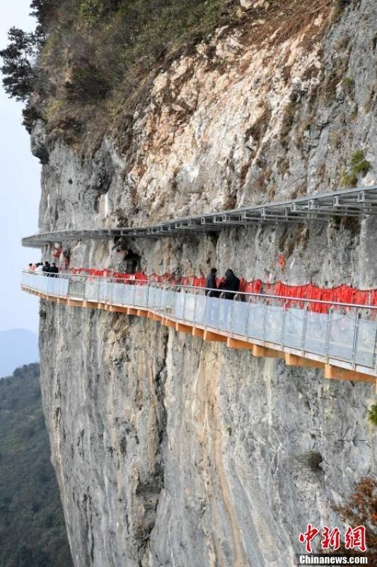 1月23日,四川省万源市八台山景区悬空玻璃栈道冬日吸引游客。