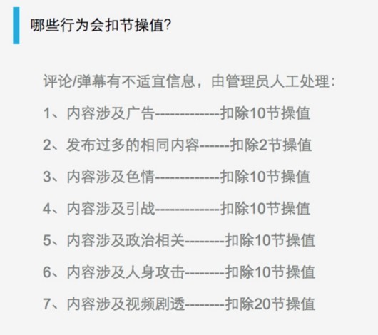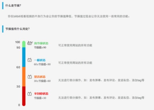 " 节操值"是哔哩哔哩弹幕网对于用户行为进行管理的一种方式,根据哔哩哔哩弹幕网介绍,如果用户在使用B站时出现不良行为,如弹幕评论内容涉及广告、色情或人身攻击时,用户账户的节操值就会相应减扣,当节操值低于一定数值时,账户就会进入禁言甚至半封停状态,无法进行发布弹幕、评论和私信,以及添加tag等部分常用操作。用户每天登录会增加1点节操值,恢复上限为70。