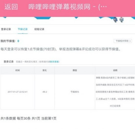 1月27日晚间,有网友在打开哔哩哔哩弹幕网(即俗称的B站)后,发现自己的账户被"禁言"无法发送弹幕和评论,原因是掉光了"节操值"。