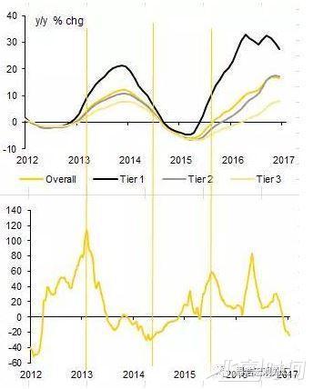 第一张图是由两张图构成,上图是主要城市的房价指数(同比增速)走势,分为总指数(overall),一线(tier-1),二线(tier-2)以及三线(tier-3),总体来看,房价的走势接近,只是一线城市的涨幅更大一些。下半截图是中国三十个主要城市的房地产成交量(同比增速)。为了便于分析,我们在图中画了三个竖线。
