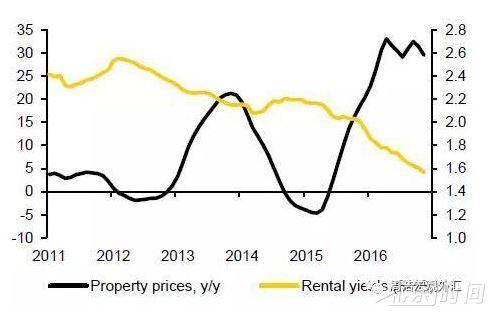 与此同时,调整是否到位可能还需要参考一个指标:租金回报率。下图是中国一线城市的房价增速与租金回报率(右轴)的关系。从图形上来看,中国一线城市的房租回报率在2016年年初跌破2%,此后伴随着房价的上升一路出现下滑,目前已经跌至1.6%的水平(很可能是历史最低),未来租房回报率如果无法出现有效的回升,那么房地产市场的内在调整压力将可能一直存在。
