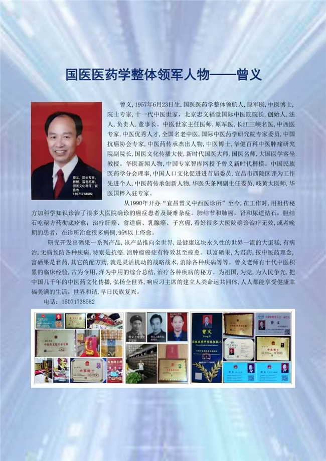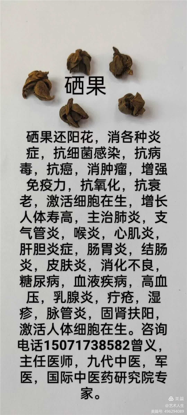 世界药王一曾义院士专家。硒果还阳花,抗各种福射,抗氧化,抗衰老,抗各种病毒,增强带谢功能,排毒养颜,消肺结节,消肿瘤抗癌特效甚至痊愈,各位医生需要送你们各位医生,各3到5克,,硒果还阳花是海拔3千米左右自然生长的草苯植物药,此药含有,v,D,C,B2,B1.S0D等硒元素成分,对于DNA的调节正常有特效。一个人一个月用冷开水侵后,早晨空复腿喝30毫升,晚上空腹喝,味苦,清热解毒的特殊功,不含任何化学成分的天然植物草苯植物的中草药,是十一代传男,不传女留下来保肝肾,肺,脾胃的特效中草药,任资料都找不到的中草药,我曾义,主任自己以断断续续喝快五十多年了,我的实际年岁,以进人75岁了,沒有任疾病。精换发。希望我们人类都相信我。我办的有医院,诊所,中草药堂,把你们的联系电话和地址告诉我,我送你们本人喝作点十一代中医世家的贡献,喝之前作个细统的全身检查,喝两个后在复查,看各项指标正不正常,全身有那些症状减轻或好了,总结经验,弘扬中医文。为国家,党和人民作贡献。把我们所有中医行业的人,都保护得健健康康,以事实证明中草药是真正保护人身体永远健康的法宝,国宝。直得所有枝持发展,使人类少得病,不得病。你们大量作宣传给亲戚朋友,甚至到习主席那里,得到主席的枝持。我们全国人民都喝上此硒果还阳花,少得病,不得病,有病多喝硒果还阳花达到特效甚至痊愈,无病防病。那位同志能和中央主要育长联系得上,把硒果还阳花配方产品生产成大国品牌,走向全世界,为人类就立了大公德,中华儿女,就子子孙孙挂金牌,繁荣昌盛。联系电话,15071738582,曾义,主任医师,原军医,中西医专家,十一代中医世家继承人曾义。