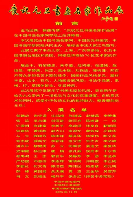 本网讯 金马迎新,翰墨传情。“庆祝元旦书画名家作品展”在中国书画名家网等线上拉开帷幕。