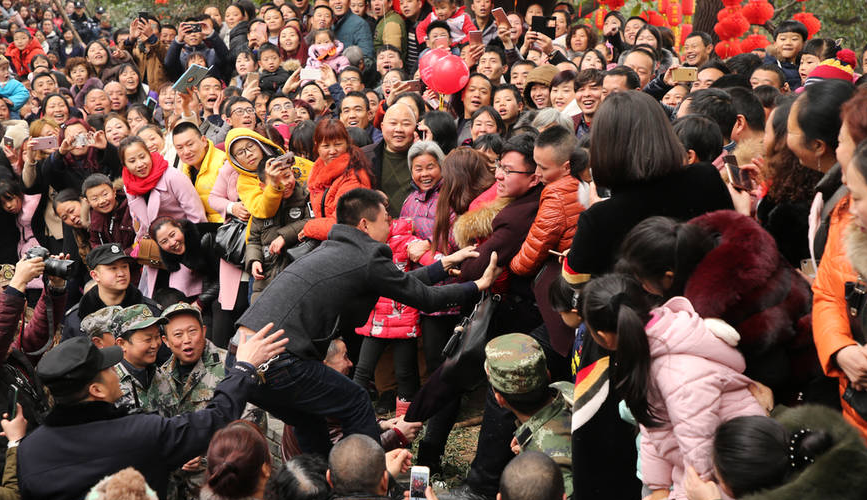 2017年2月12日,四川省德阳市。正月十六,一年一度的广汉保保节拉开大幕。大量游客涌入广汉市区狂欢,感受300多年来传承至今的民俗节日。“在广汉,没过正月十六,那都不算过完年。”保保是四川方言,意为为了保佑小孩儿长大,找命好的人做干爹干妈。一年一度的“保保节”吸引了20万余人涌入广汉。