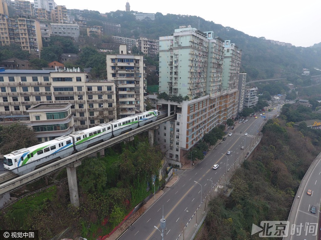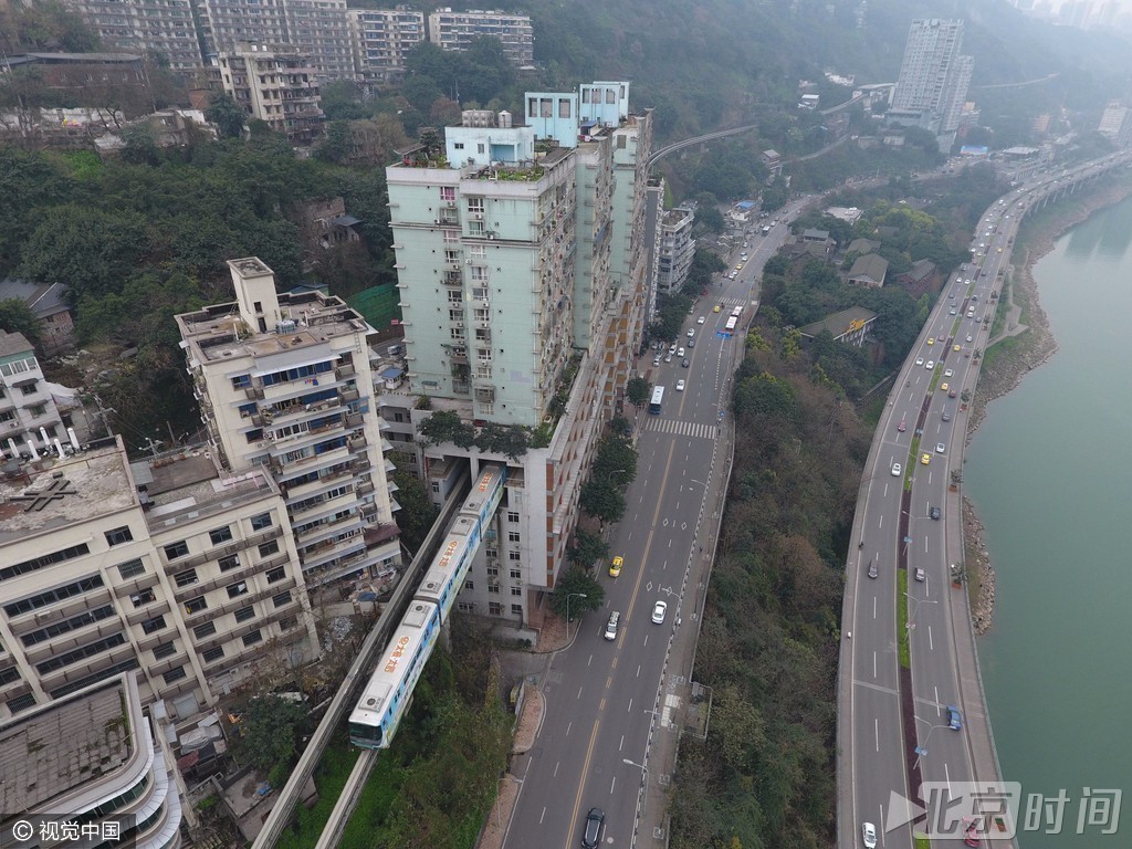 在6根轻轨柱子与楼房建筑之间,有20厘米的安全距离,所以轻轨的运营不会带来楼栋的震动。托举轨道的柱子看不见,而是埋在下层的房子里。从大楼第一层算起,轨道有6根托举柱子,每根长约22米。