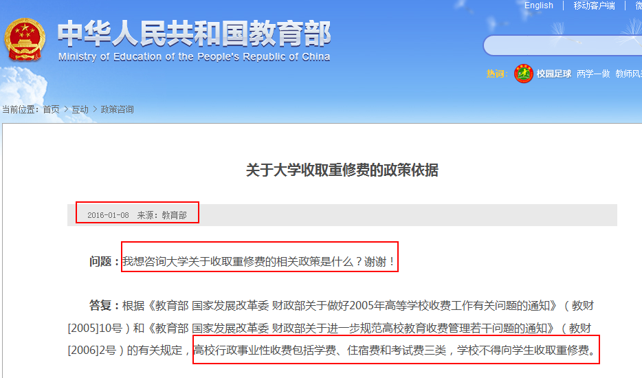 北京时间“此刻”(微信号:btimenow)在教育部官网发现,2016年,教育部曾经就大学收取重修费这一问题作出明确回应,高校行政事业收费包括学费、住宿费和考试费三类,学校不得向学生收取重修费。