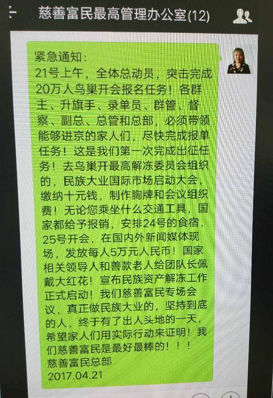 4月21日,张大爷所在的"慈善富民"微信群发布消息称,"最高民族资产解冻委员会"组织的"民族大业国际市场启动大会"将于4月25日在鸟巢召开,只需缴10元钱制作胸牌,就可在大会现场领取5万元慈善金,而且参会人员到北京,可报销路费,并安排一晚住宿。