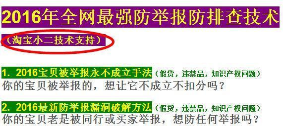 在某平台中,记者发现了一条标题为“2016淘宝防举报技术(防同行举报防系统排查)”的链接,点击进入后发现,网站全篇都在介绍如何利用防举报技术躲过淘宝后台的审核,让假货、违禁品以及涉及知识产权的商品举报不成立。网站甚至强调,还能帮助这类商品在8天内登上淘宝首页,成为爆款。