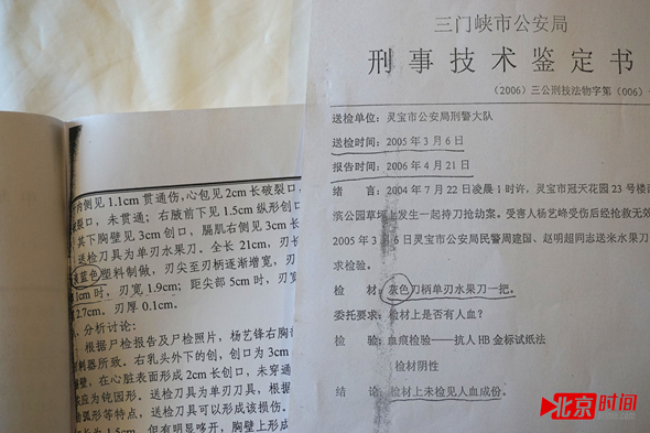 “北京时间”(微信号:Btimedc)注意到:2005年12月29日公安部一份《物证检验意见书》显示:灵宝市公安局送检的从嫌疑人家中提取的刀具一把,刀柄由淡蓝色塑料制作。而2006年4月21日三门峡市公安局一份《刑事技术鉴定书》显示,灵宝市公安局送检的刀具,刀柄为灰色。