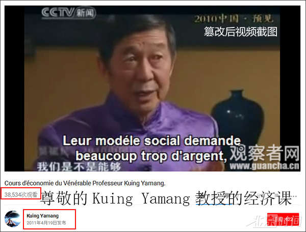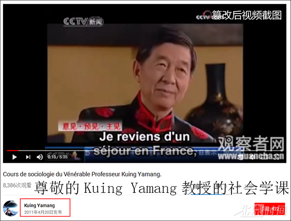 该视频的上传者正是“Kuing Yamang”,经查证,该账户在2011年发布了多条以吴建民大使与白岩松为主角的“精加工”视频。在其中一条采用新素材的视频中,蓝衣换红衣的吴建民大使“化名Kuing Yamang”,“在字幕中”给观众讲起了社会学,曾经常住法国的“Kuing Yamang”教授向大家解释了“法国人为什么是世界上最悲观的人”。