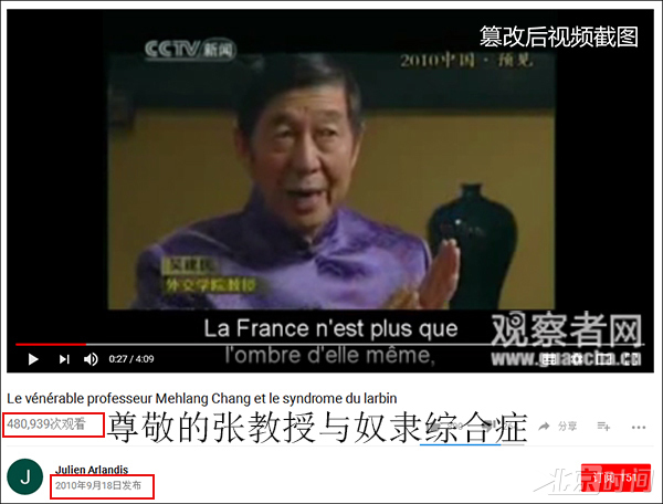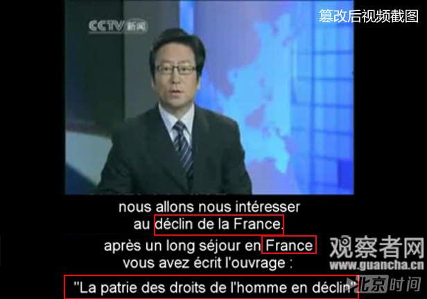 该视频的节选画面与近期视频完全相同,唯一不同的是,这则视频的字幕主要负责唱衰法国,而非非洲。由吴大使“扮演”的“张教授”出了本名为《正在衰落的人权鼻祖》的书,曾长期在法国居住,在视频中称法国是一个“濒临失败的国家”,主持人也表示赞同。在接下来的字幕中,“张教授”开始猛烈抨击法国恶劣的社会现状,字幕与二人的动作表情甚为相配,满满的“嘲笑”溢出屏幕。