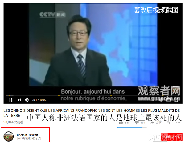 随后,观察者网编辑在国外视频平台上找到了李主任所提及的视频。视频界面显示,这段原为白岩松采访吴大使的对话视频点击量已达近9万次,于今年9月29日上传发布,而视频标题赫然写着“中国人称非洲法语国家的人是地球上最该死的人”,完全扭曲了原视频内容。