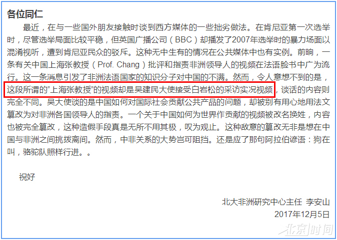 据“北京大学非洲研究中心”微信公众号12月11日报道,该中心主任李安山在一封告同仁信中披露了吴大使采访视频被篡改一事。