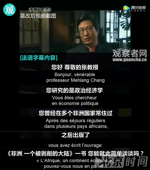 在接下来的字幕中,“张教授”直指非洲当地知识分子是“害虫”,资质平庸;为了保证非洲法郎的使用而给法国送钱;当地政府官员、医生等知识分子像乞丐似的在法国领事馆前排起长队,但法国的流浪者却可以随意去往任一非洲国家的首都。字幕还为这档“经济节目”配了结束语。