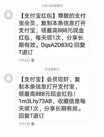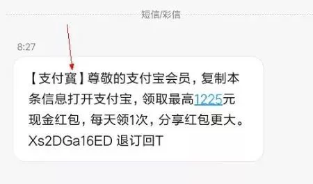 这些以【支付宝】或【支付宝红包】打头的短信,要求收短信者复制此条信息打开支付宝,就可以领取现金红包,每天领一次!
