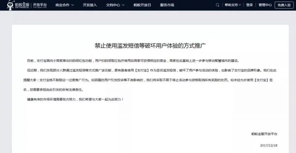 那么,出现以上情况又会如何应对呢?支付宝方面称:已发布公告表达了我们的态度和有可能采取的措施。在赚钱红包”活动规则“及蚂蚁金服开放平台,我们都明确不能采用类似方式推广,否则我们会取消活动参与资格。
